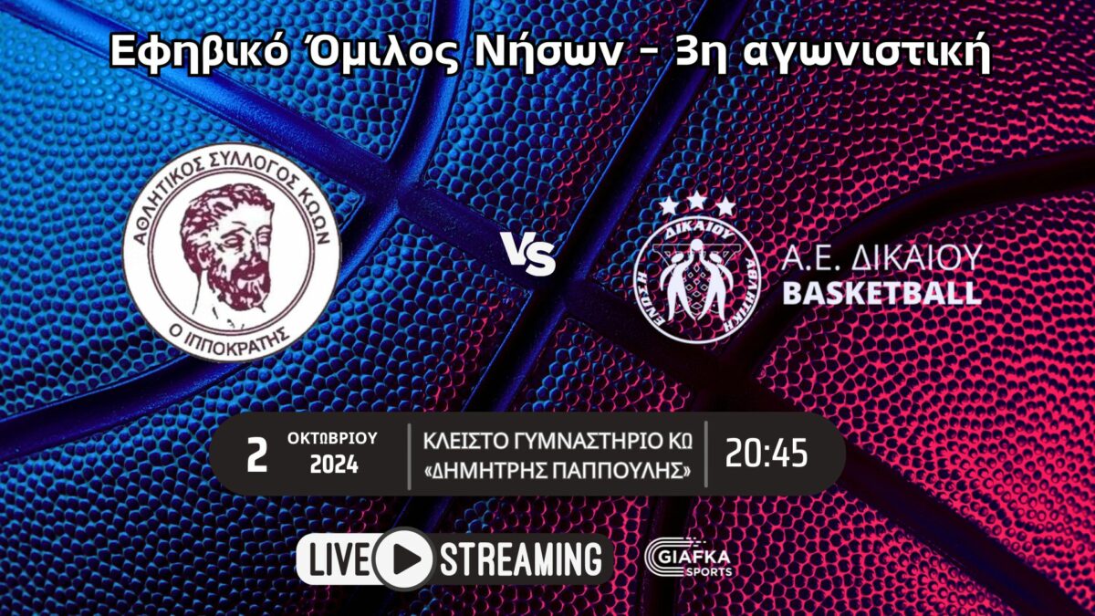 Για την 3η αγωνιστική του εφηβικού πρωταθλήματος ο Ιπποκράτης υποδέχεται στις 20:45 στο Κλειστό γυμναστήριο Κω «Δημήτρης Παππούλης» την Α.Ε Δικαίου. Παρακολουθήστε το ματς σε Live Streaming απ’ το giafkasports.gr