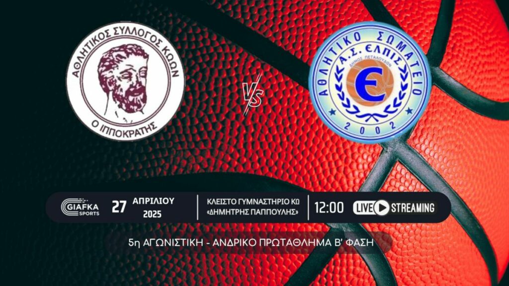 Για την 5η αγωνιστική της Β’ φάσης του ανδρικού πρωταθλήματος ο πρωταθλητής Ιπποκράτης υποδέχεται την Κυριακή στις 12:00 στο Κλειστό γυμναστήριο Κω «Δημήτρης Παππούλης» την Ελπίδα Πεταλουδών. Παρακολουθήστε το ματς σε Live Streaming απ’ το giafkasports.gr