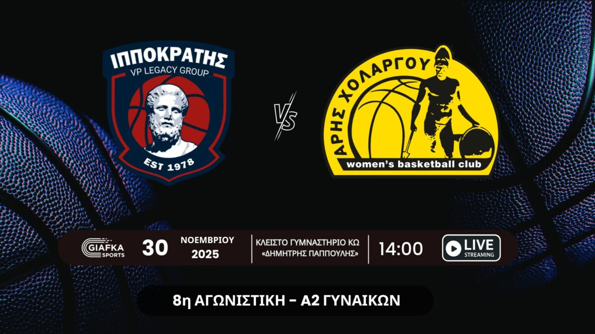 Για την 8η αγωνιστική της Α2 γυναικών ο Ιπποκράτης VP Legacy Group υποδέχεται την Κυριακή στις 14:00 στο Κλειστό γυμναστήριο Κω «Δημήτρης Παππούλης» τον Άρη Χολαργού. Παρακολουθήστε το ματς σε Live Streaming απ’ το giafkasports.gr