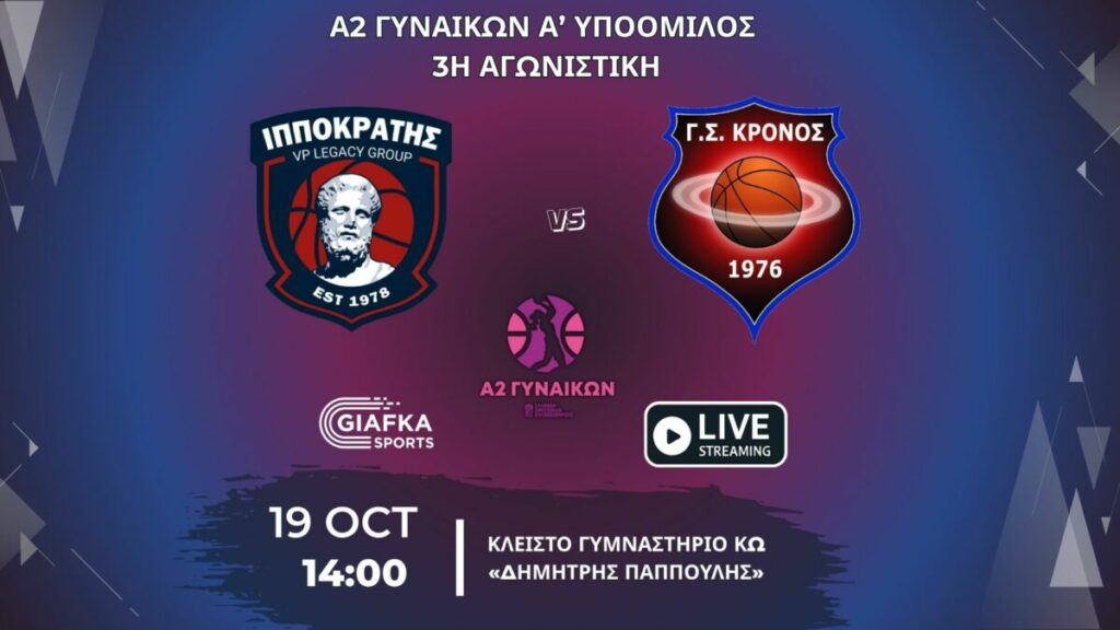Για την 3η αγωνιστική της Α2 γυναικών ο Ιπποκράτης VP Legacy Group υποδέχεται τον Κρόνο Αγίου Δημητρίου την Κυριακή στις 14:00 στο Κλειστό γυμναστήριο Κω «Δημήτρης Παππούλης». Παρακολουθήστε το ματς σε Live Streaming απ’ το giafkasports.gr.