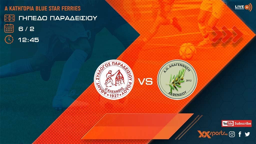 Για την 19η αγωνιστική της Α’ κατηγορίας η Αναγέννηση Ασφενδιού αντιμετωπίζει εκτός έδρας τον Κλεάνθη Παραδεισίου στις 12:45. Δείτε το ματς σε Live Streaming σε παραγωγή του xxsports.org.