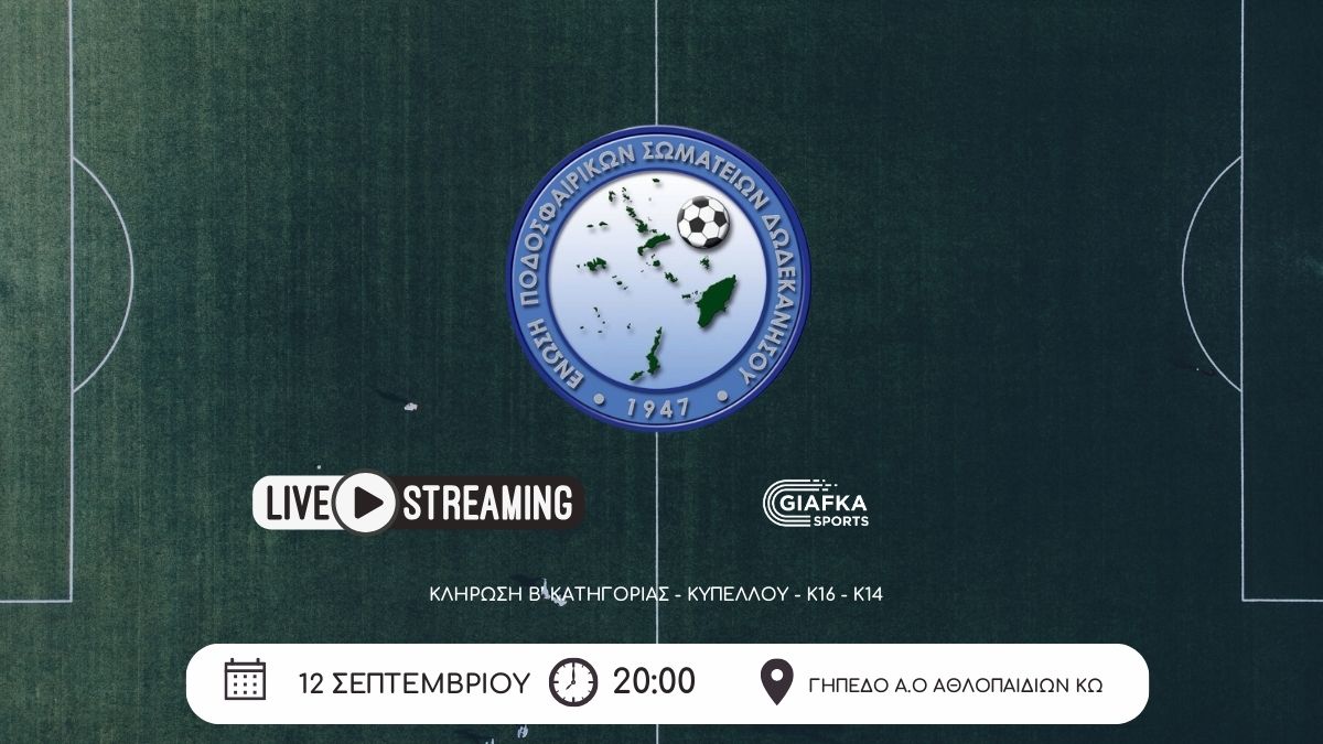 ”Την Τρίτη 12.09.2023 και ώρα 20:00, στις αθλητικές εγκαταστάσεις του Ομίλου Αθλοπαιδιών Κω, θα πραγματοποιηθεί η κλήρωση για την Β’ Κατηγορία Δωδεκανήσου, όμιλος νήσων, του Κυπέλλου Δωδεκανήσου, όμιλος νήσων και των υποδομών (Κ-16 & Κ-14), όμιλοι νήσων”.