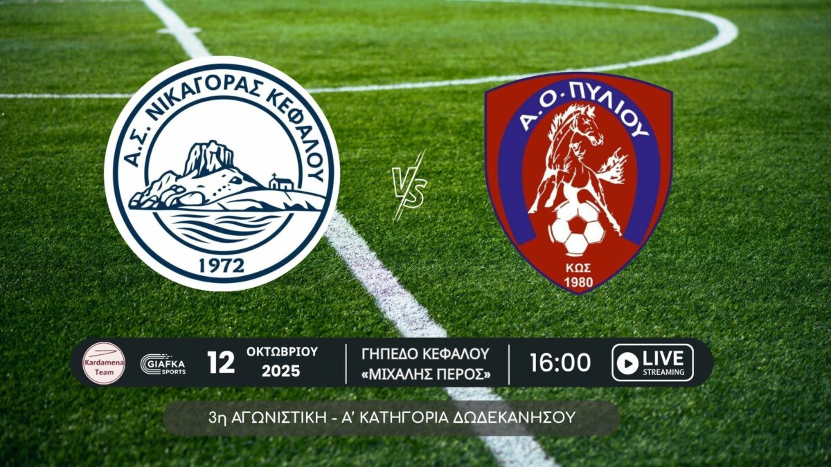 Παρακολουθήστε σε Live Streaming το τοπικό ντέρμπι της 3ης αγωνιστικής της Α’ κατηγορίας Δωδεκανήσου ανάμεσα σε Νικαγόρα και Α.Ο Πυλίου σε παραγωγή του kardamena-team απ’ το Δημοτικό γήπεδο Κεφάλου «Μιχάλης Πέρος» στις 16:00.