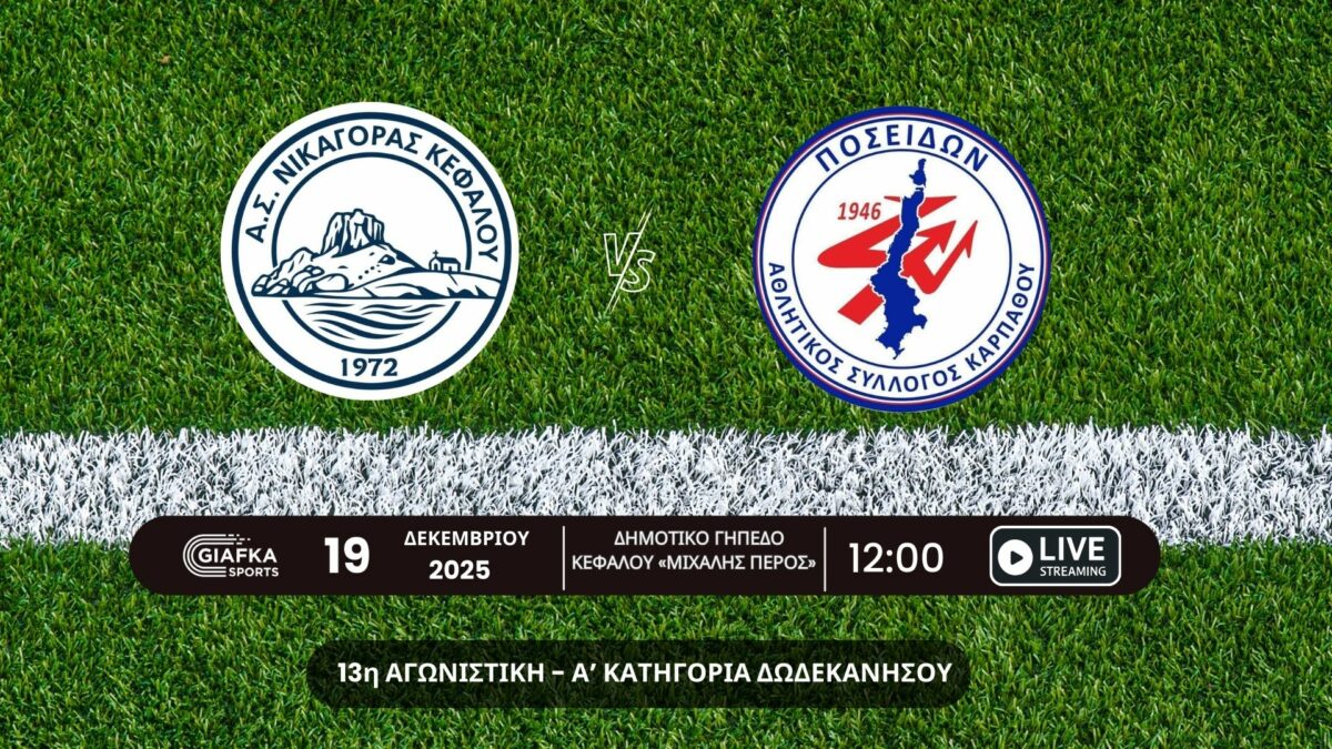 Για την 13η αγωνιστική της Α’ κατηγορίας ο Νικαγόρας υποδέχεται την Παρασκευή στις 12:00 στο Δημοτικό γήπεδο Κεφάλου «Μιχάλης Πέρος» τον Ποσειδώνα Καρπάθου. Παρακολουθήστε το ματς σε Live Streaming απ’ το giafkasports.gr