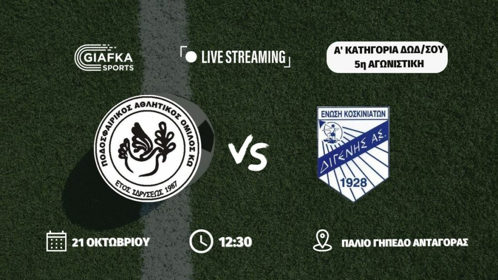 Παρακολουθήστε σε Live Streaming απ’ το giafkasports.gr το ματς για την 5η αγωνιστική της Α’ κατηγορίας ανάμεσα σε ΠΑΟΚ Κω και Διγενή Κοσκινού το Σάββατο 21 Οκτωβρίου στις 12:30 απ’ το παλιό γήπεδο Ανταγόρας.