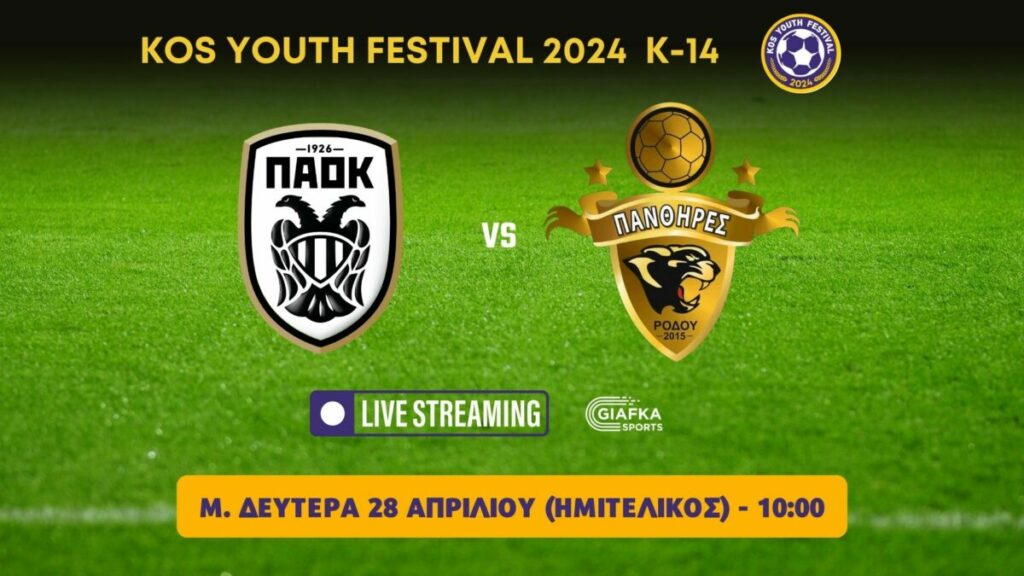 Παρακολουθήστε σε Live Streaming για 3ο Kos Youth Festival το ματς για τον ημιτελικό της Κ-14 ανάμεσα σε ΠΑΟΚ και Πάνθηρες την Μ. Δευτέρα 29/4 στις 10:00