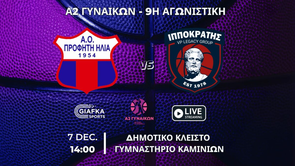 Για την 9η αγωνιστική της Α2 γυναικών ο Ιπποκράτης αντιμετωπίζει εκτός έδρας τον Προφήτη Ηλία στο Κλειστό γυμναστήριο Καμινιών. Δείτε το ματς σε Live Streaming απ’ το giafkasports.gr