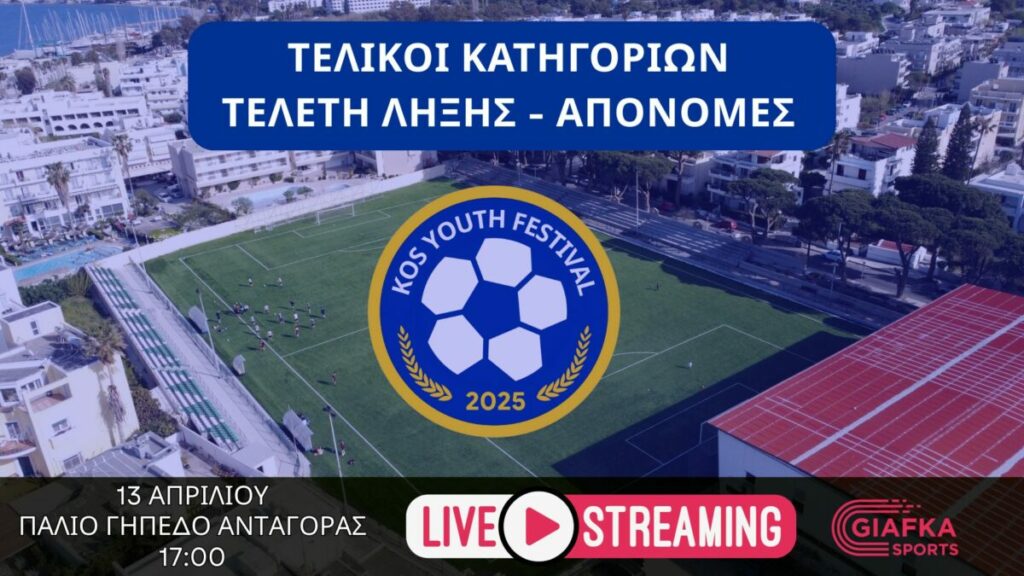 Την Κυριακή απ’ τις 17:00 ξεκινάει η γιορτή του 4ου Κοs Youth Festival στο παλιό γήπεδο Ανταγόρας με τους τελικούς ανά κατηγορία και στην συνέχεια με την τελετή λήξης και τις απονομές. Παρακολουθήστε σε Live Streaming μέσα απ’ το giafkasports.gr.