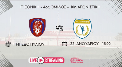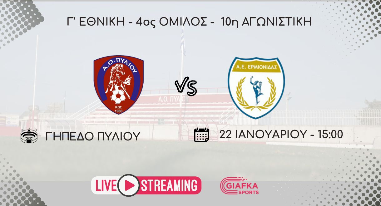 Για την 10η αγωνιστική του 4ου Ομίλου της Γ’ Εθνικής ο Α.Ο Πυλίου υποδέχεται την Κυριακή 22 Ιανουαρίου στις 15:00 την Α.Ε Ερμιονίδας.