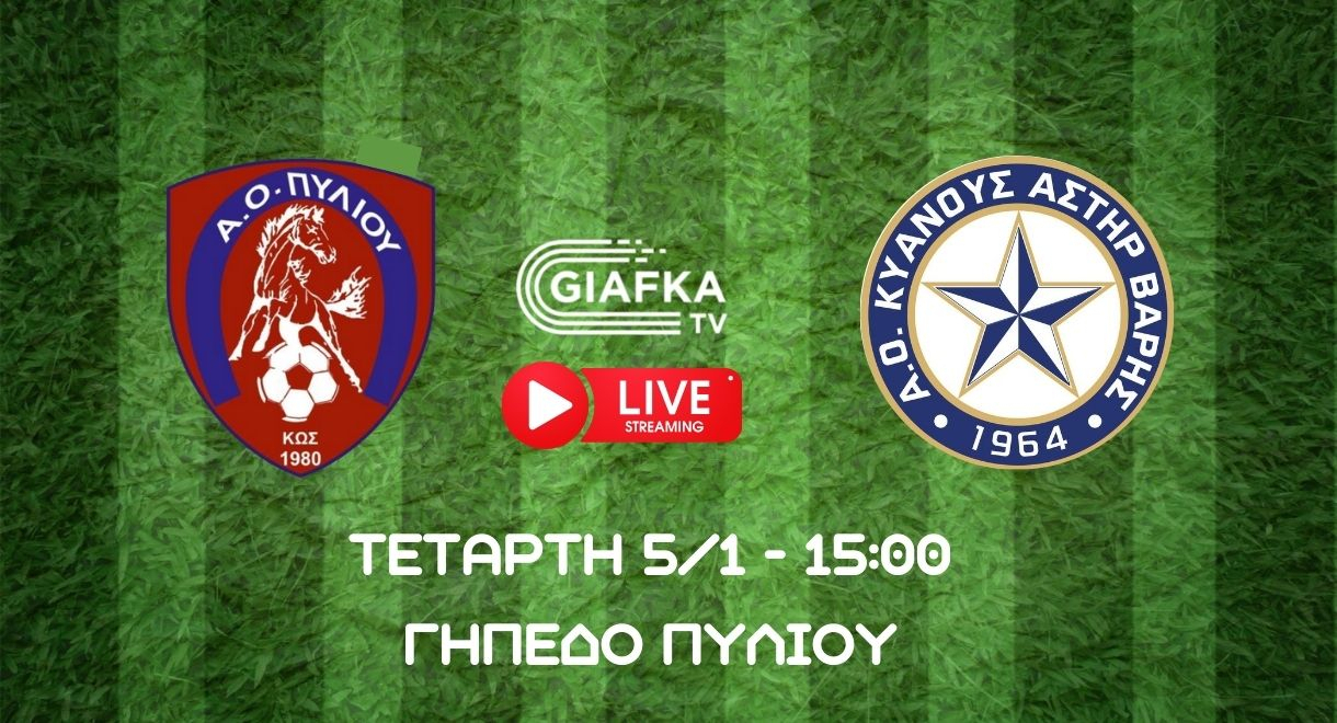 Δείτε σήμερα στις 15:00 σε Live Streaming απ’ το giafkasports.gr την εξ αναβολής αναμέτρηση για την 8η αγωνιστική της Γ’ Εθνικής (6ος Όμιλος) ανάμεσα σε Α.Ο Πυλίου και Αστέρα Βάρης.