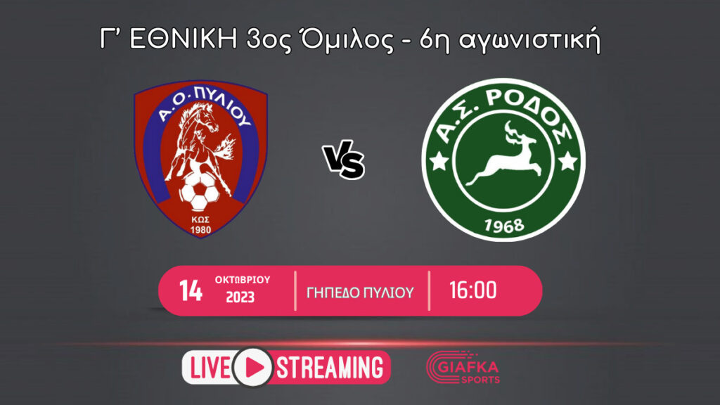Παρακολουθήστε σε Live Streaming απ’ το giafkasports.gr το ματς της 6ης αγωνιστικής για την Γ’ Εθνική (3ος Όμιλος) ανάμεσα σε Α.Ο Πυλίου και Ρόδο το Σάββατο 14/10 στις 16:00.