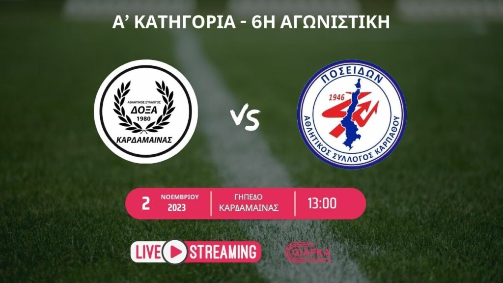 Παρακολουθήστε σε Live Streaming απ’ το giafkasports.gr την Πέμπτη 2 Νοεμβρίου στις 13:00 το ματς για την 6η αγωνιστική της Α’ κατηγορίας ανάμεσα σε Δόξα Καρδάμαινας και Ποσειδώνα Καρπάθου.