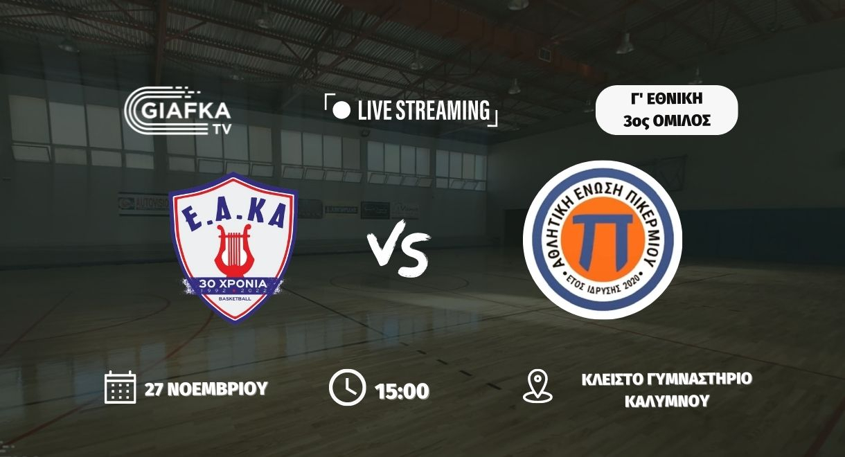 Παρακολουθήστε την Κυριακή 27/11 στις 15:00 την αναμέτρηση για την 7η αγωνιστική της Γ’ Εθνικής (3ος Όμιλος) ανάμεσα σε Ε.Α.ΚΑ και Α.Ε Πικερμίου σε Live Streaming απ’ το giafkasports.gr