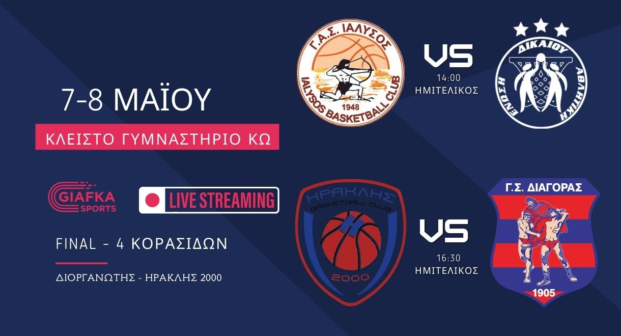 Παρακολουθήστε σε Live Streaming τους ημιτελικούς για το Final-4 κορασίδων που διεξάγεται στο Κλειστό γυμναστήριο Κω. Στις 14:00, Ιάλυσος – Α.Ε Δικαίου και στις 16:30, Ηρακλής 2000 – Διαγόρας