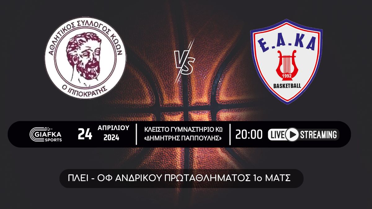 Παρακολουθήστε την Τετάρτη 24 Απριλίου στις 20:00 απ’ το Κλειστό γυμναστήριο Κω «Δημήτρης Παππούλης» το ματς για την 1η αγωνιστική των πλέι οφ του ανδρικού πρωταθλήματος ανάμεσα σε Ιπποκράτη και Ε.Α.ΚΑ απ’ το giafkasports.gr