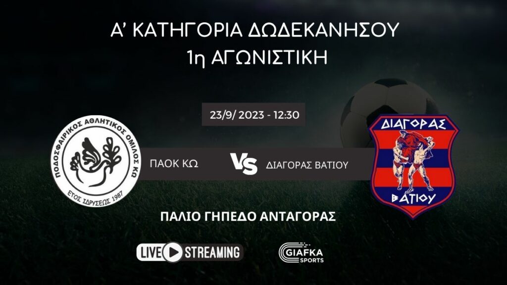 Παρακολουθήστε σε Live Streaming το Σάββατο 23/9 στις 12:30 το ματς για την 1η αγωνιστική της Α’ κατηγορίας Δωδεκανήσου ανάμεσα σε ΠΑΟΚ Κω και Διαγόρα Βατίου απ’ το giafkasports.gr
