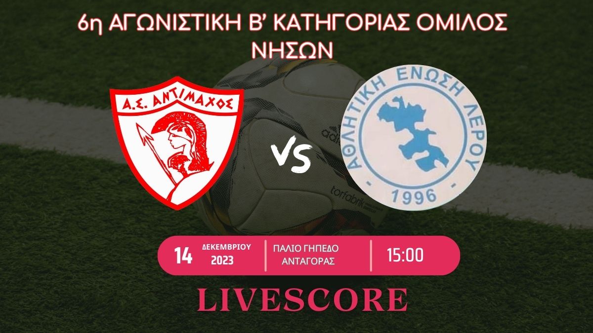 Για την 6η αγωνιστική της Β’ κατηγορίας του Ομίλου νήσων ο Αντίμαχος υποδέχεται στις 15:00 στο παλιό γήπεδο Ανταγόρας την Α.Ε Λέρου. Παρακολουθήστε την εξέλιξη του σκορ μέσα απ’ το giafkasports.gr