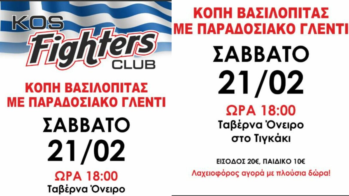 Το Διοικητικό Συμβούλιο του Σωματείου «ΜΑΧΗΤΕΣ ΤΗΣ ΚΩ (KOS FIGHTERS CLUB)» ανακοινώνει τη διοργάνωση της ετήσιας χοροεσπερίδας του, η οποία θα πραγματοποιηθεί το Σάββατο 21 Φεβρουαρίου 2026, στην ταβέρνα «Όνειρο», στο Τιγκάκι, με ώρα έναρξης 18:00.