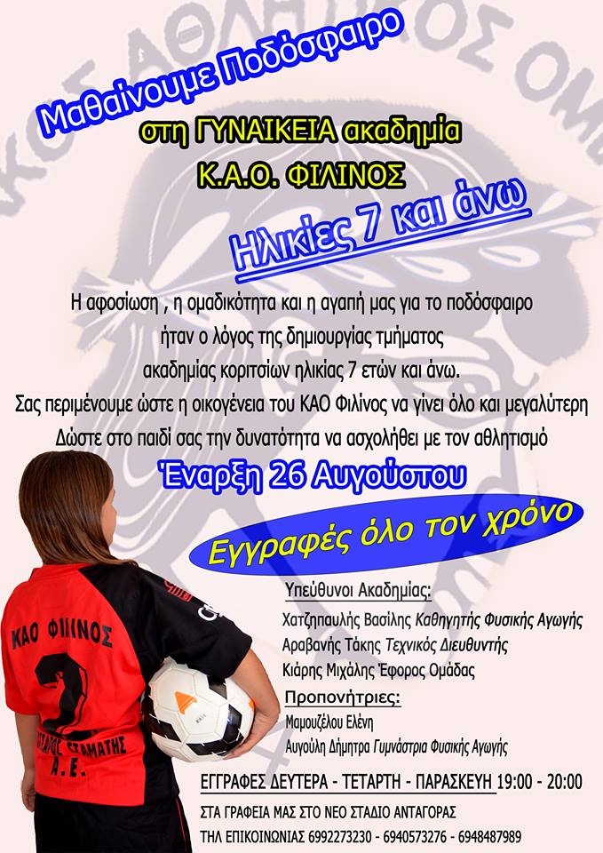 Σας περιμένουμε ώστε η οικογένεια του ΚΑΟ Φιλίνος να γίνει όλο και μεγαλύτερη. Δώστε στο παιδί σας την δυνατότητα να ασχοληθεί με τον αθλητισμό.
