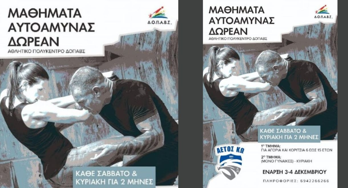 Για την καλλιέργεια της αυτοπεποίθησης και της αυτοπροστασίας μικρών και μεγάλων αθλητών ή μη, ο αθλητικός σύλλογος Αετός Κω διοργανώνει μαθήματα Αυτοάμυνας με βασικές τεχνικές για το πως μπορεί κανείς να προστατέψει τον εαυτό του σε μια ενδεχόμενη επίθεση. Απευθύνεται σε άντρες και σε γυναίκες, όλων των ηλικιών, οποιασδήποτε φυσικής κατάστασης ή σωματότυπου και δεν απαιτείται προηγούμενη εμπειρία σε πολεμικές τέχνες. Η εκπαίδευση διεξάγεται με απόλυτη ασφάλεια και δεν εγκυμονεί κινδύνους τραυματισμών. Τα Μαθήματα Αυτοάμυνας θα διεξάγονται κάθε Σάββατο και Κυριακή από 3 & 4 /12 στο Αθλητικό Πολύκεντρο του Δ.Ο.Π.Α.Β.Σ. Δήμου Κω για 2 μήνες. Το Σάββατο απευθύνεται σε αγόρια και κορίτσια από 6 έως 16 ετών και την Κυριακή σε γυναίκες από 18 ετών και άνω.