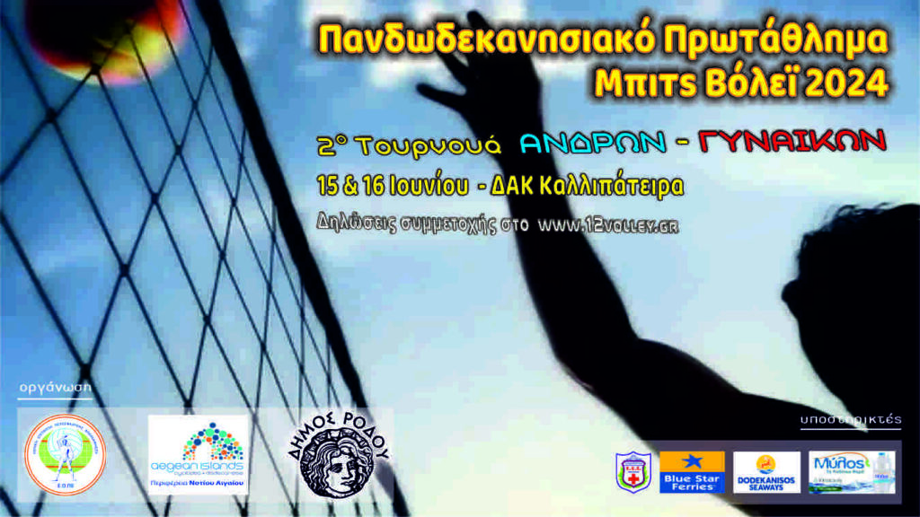 Με τη συμμετοχή 13 γυναικείων ομάδων και 10 ανδρικών πραγματοποιείται το σαββατοκύριακο 15 & 16 Ιουνίου στο ΔΑΚ Καλλιπάτειρα το 1ο φετινό τουρνουά μπιτς βόλεϊ που διοργανώνει η Τοπική Επιτροπή Βόλεϊ Δωδεκανήσου σε συνεργασία με την Περιφέρεια Νοτίου Αιγαίου και τον Δήμο Ρόδου, με υποστηρικτές το Σώμα Εθελοντών Σαμαρειτών και Διασωστών του Ελληνικού Ερυθρού Σταυρού Ρόδου, την Κάβα Κυριακούλη (νερό ‘Μύλος’), τη Dodekanisos Seaways και την Blue Star Ferries.