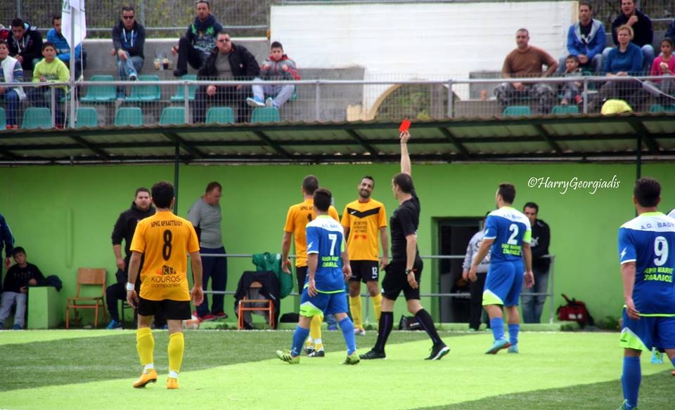 Επιβάλλει στο Σωματείο ΑΟ ΒΑΘΥ την πειθαρχική ποινή στέρησης του δικαιώματος να αγωνίζεται στην έδρα του για δύο /2/ αγων/κές και χρηματικό πρόστιμο εκατόν πενήντα /150/ Ευρώ (Αρθρο 15 παρ.8 περ.δ.και Άρθρο 15 παρ.8 περ.α του Π.Κ. /Στον αναγραφόμενο στην συμπληρωματική έκθεση του Διαιτητή και την εκθεση του παρατηρητή αγώνος ΕΜ.ΧΑΝΔΑΚΑΡΗ μέλος του Δ.Σ. του ΑΟ ΒΑΘΥ ποινή απαγόρευσης συμμετοχής σε οποιαδήποτε δραστηριότητα σχετίζεται με το ποδ/ρο για έξι /6/ μήνες και χρηματικό πρόστιμο εκατό /100/ Ευρώ (Αρθρο 26 παρ.1,2,3 του Π.Κ. σε συνδυασμό με το Αρθρο 25 του Π.Κ.)
