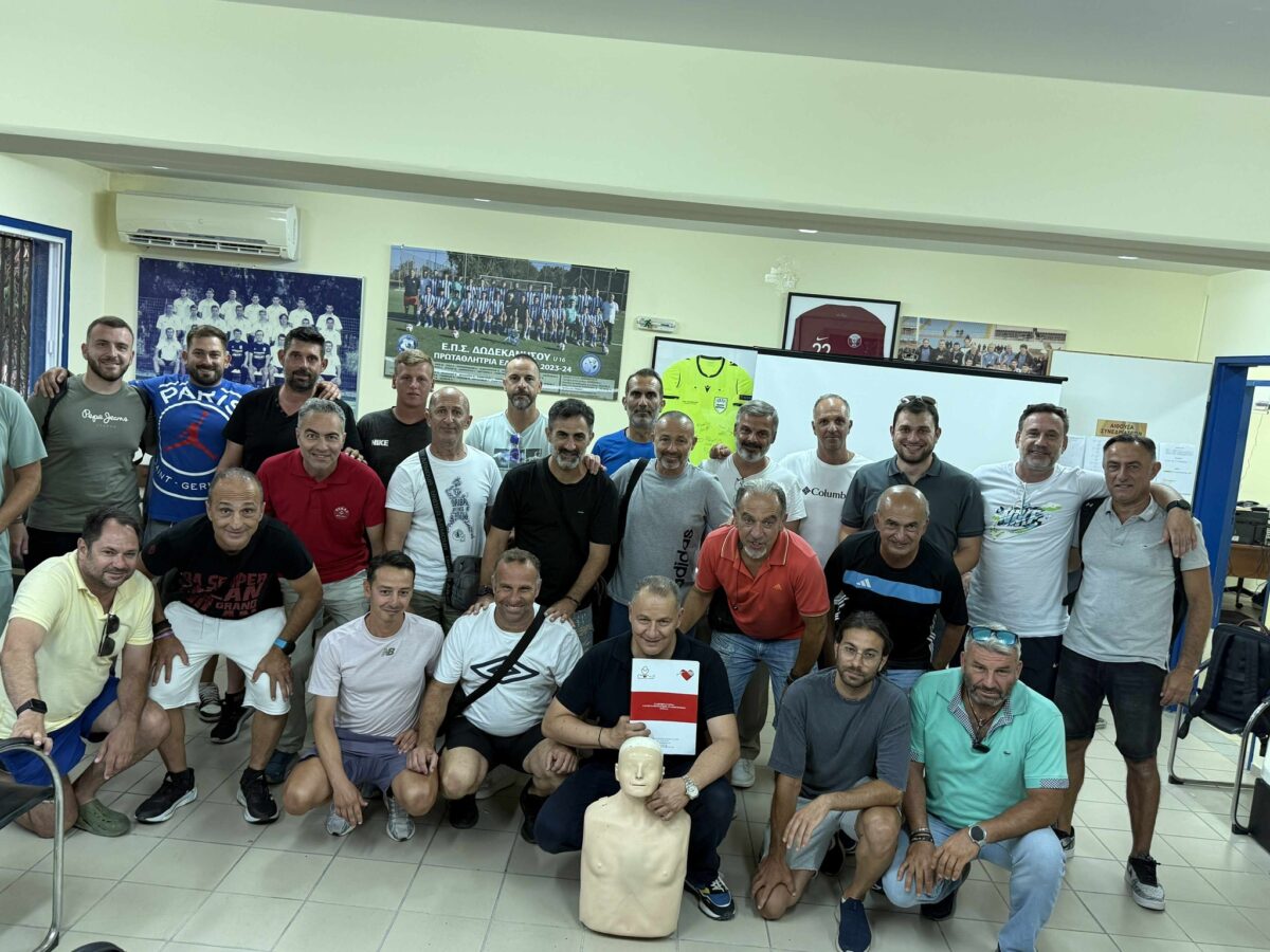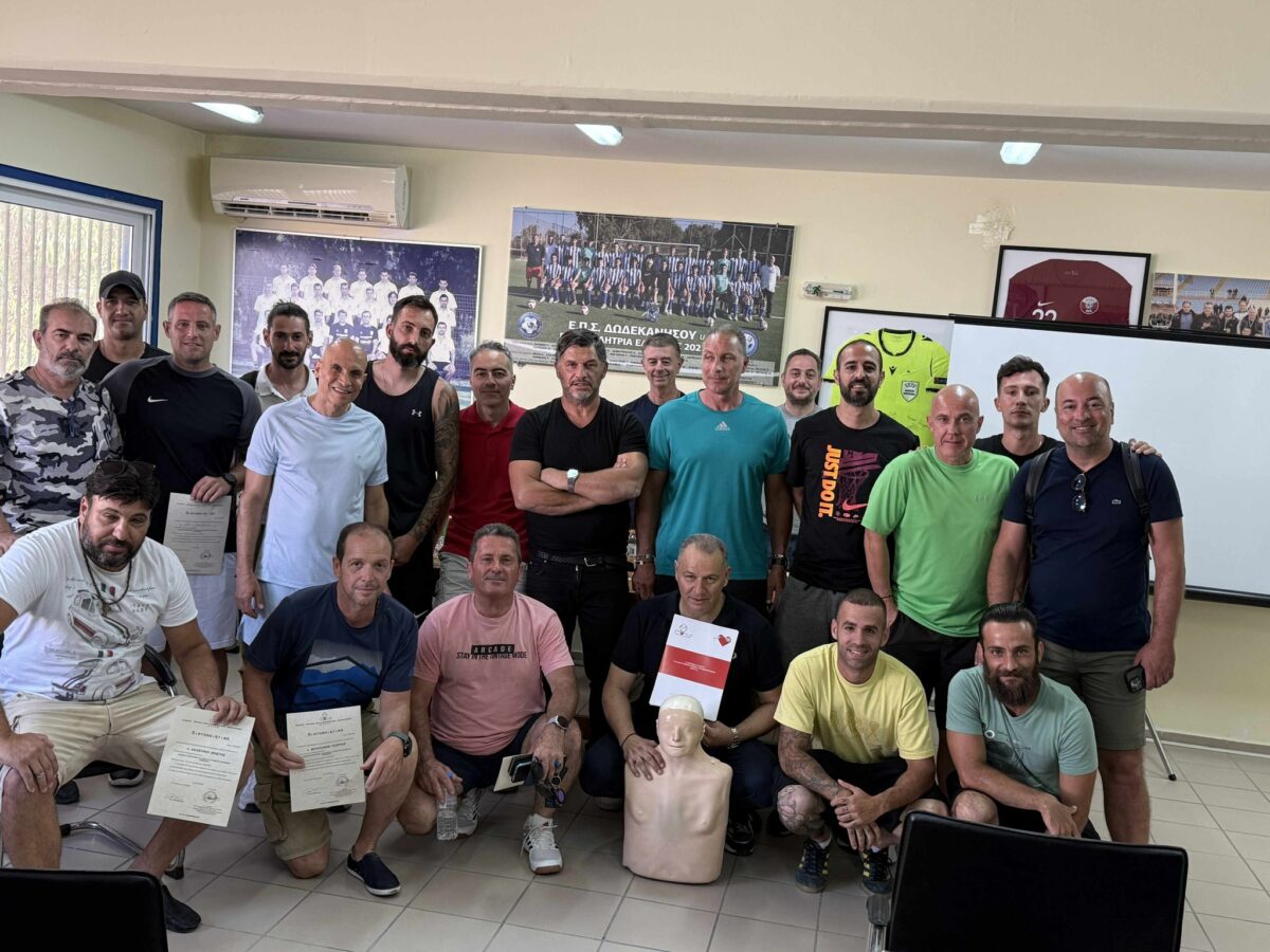 Ολοκληρώθηκε επιτυχώς το σεμινάριο πρώτων βοηθειών χθες στα γραφεία της Ε.Π.Σ.Δ., με πρωτοβουλία της Ένωσης και σε συνεργασία με το Σύνδεσμο Προπονητών Ποδοσφαίρου Δωδεκανήσου. Το σεμινάριο, προσφέρθηκε δωρεάν στα μέλη του Συνδέσμου Προπονητών Δωδεκανήσου από την ΕΠΣ Δωδεκανήσου. Το σεμινάριο παρακολούθησαν 45 προπονητές. Λόγω της μεγάλης συμμετοχής και ανταπόκρισης στο κάλεσμα, το σεμινάριο χωρίστηκε σε δύο τμήματα και η εκπαίδευση έτυχε ιδιαίτερης αποδοχής από τους συμμετέχοντες.