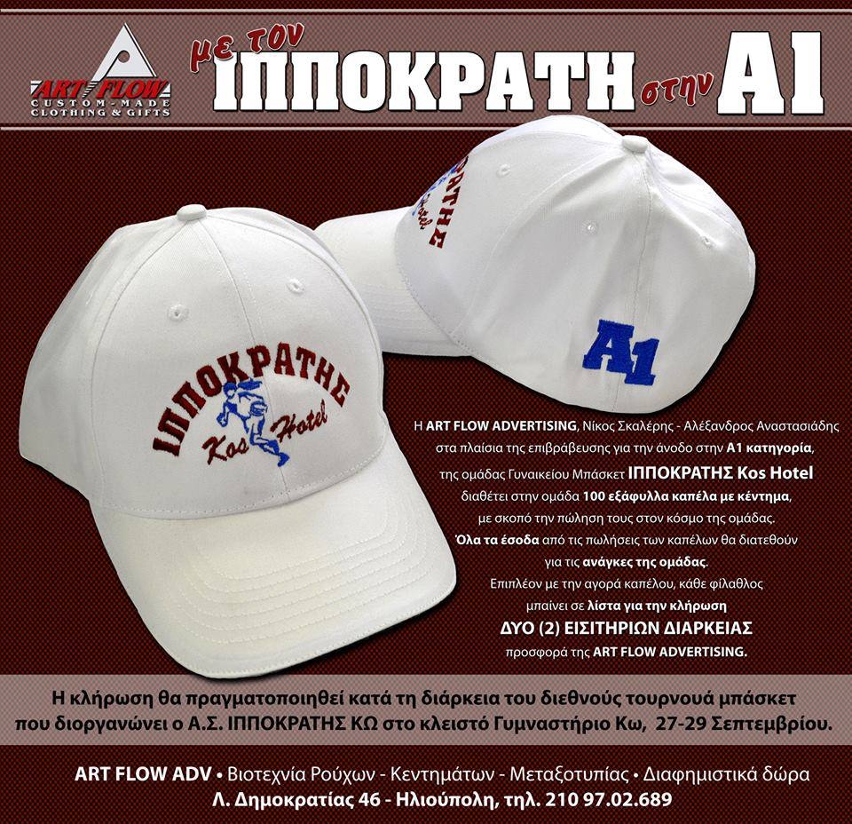 H Art Flow Advertising (Νίκος Σκαλέρης- Αλέξανδρος Αναστασιάδης) στο πλαίσιο της επιβράβευσης για την άνοδο στην Α1 κατηγορία της ομάδας γυναικείου μπάσκετ Ιπποκράτης Kos Hotel διαθέτει 100 εξάφυλλα καπέλα με κέντημα με σκοπό την πώληση τους στον κόσμο της ομάδας.