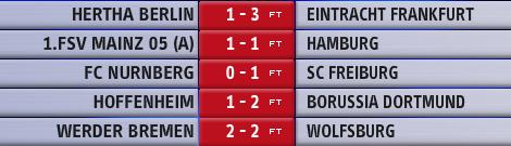 Μεγάλα διπλά έκαναν Άιντραχτ και Ντόρτμουντ στις απέναντι σε Χέρτα και Χοφενχάιμ.Στα υπόλοιπα ματς ξεχώρισε η ισοπαλία ανάμεσα σε Βέρντερ και Βόλσμπουργκ με τον Τζέκο να πετυχαίνει 2 γκολ στο ματς.