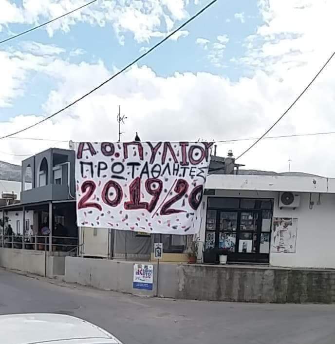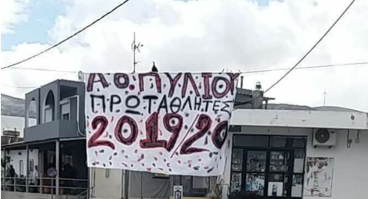 Οι “Young Devils” που ήταν κοντά στην ομάδα από το ξεκίνημα της προσπάθειας την φετινή σεζόν έφτιαξαν ένα μεγάλο πανό που γράφει Α.Ο Πυλίου πρωταθλητής 2019-2020 και το τοποθέτησαν στον δρόμο που πηγαίνει προς το γήπεδο.