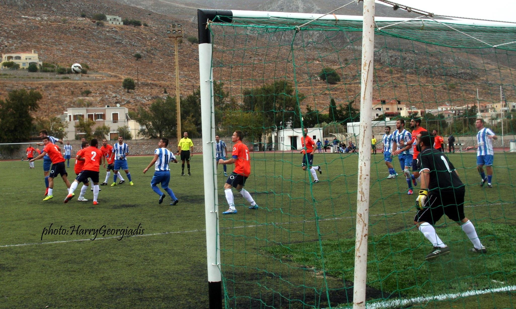 Ο φιλοξενούμενος Καλυμνιακός μπήκε καλύτερα στο ματς. Οι «κίτρινοι» είχαν την κατοχή της μπάλας και την υπεροχή σε όλες σχεδόν τις γραμμές του αγωνιστικού χώρου ,πιέζοντας αισθητά την αντίπαλη άμυνα και καταφέρνοντας να πάρουν το προβάδισμα στο 22ο λεπτό.Συγκεκριμένα ο Κλειδαράς με ωραία προσωπική ενέργεια από τα αριστερά, ελευθερώθηκε όμορφα και με εξαιρετικό σούτ, έκανε το 0-1, «παγώνοντας» τα Κοσκινού.Από κει και έπειτα επικράτησε ένας μονόλογος των γηπεδούχων οι οποίοι μπόρεσαν πριν την λήξη του πρώτου μέρους να φέρουν στα ίσα το ματς.Ήταν στο 44’ όταν μετά από έξυπνη παράλληλη σέντρα του Χωρίτη, ο νεοεισελθόντας Καστρουνής από κοντινή απόσταση πλάσαρε και νίκησε τον Ζερβό για το 1-1.