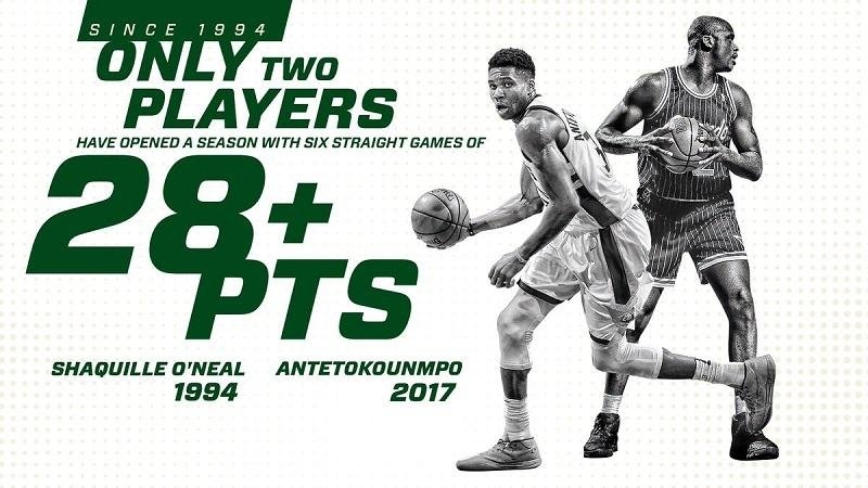 Έτσι, ο Γιάννης έγινε ο δεύτερος παίκτης στην ιστορία του ΝΒΑ που καταφέρνει στα έξι πρώτα ματς να σημειώσει 28+ πόντους ανά αγώνα! Ο πρώτος που το είχε καταφέρει ήταν το 1994 ο Σακίλ Ο΄Νιλ με τους Μάτζικ.