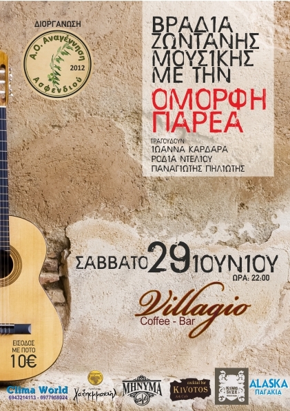 Μουσική βραδιά απ’ την Αναγέννηση Ασφενδιού το Σάββατο 29 Ιουνίου και ώρα 21:00 στο Villagio στο Ζηπάρι. Θα τραγουδήσουν οι Ιωάννα Καρδάρα, Ροδία Ντέλιου και Παναγιώτης Πηλιώτης.