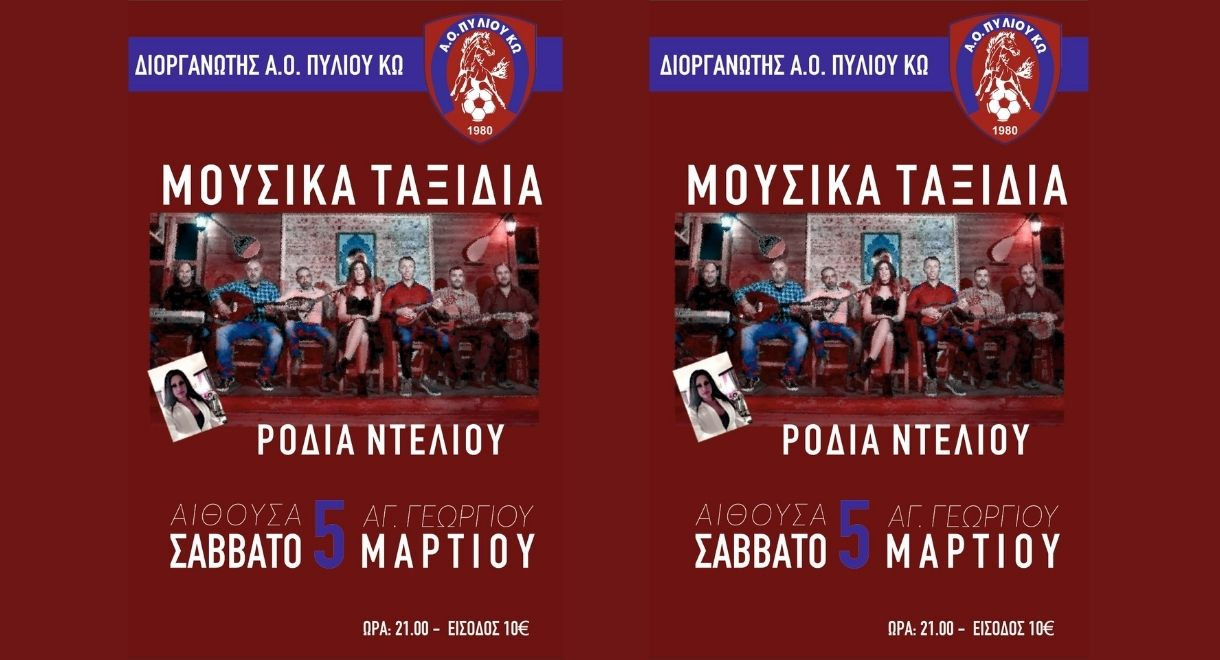 Μουσική βραδιά διοργανώνει η ομάδα του Α.Ο Πυλίου το Σάββατο 5 Μαρτίου στις 21:00 στην αίθουσα του Αγίου Γεωργίου στο Πυλί.