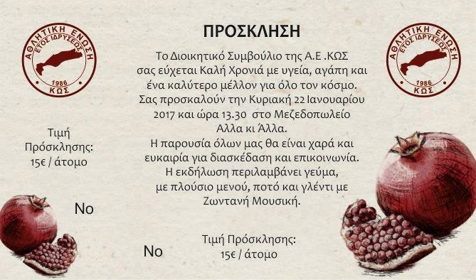 Το διοικητικό συμβούλιο της Α.Ε Κω σας εύχεται καλή χρονιά με υγεία, αγάπη και ένα καλύτερο μέλλον για όλο τον κόσμο. Σας προσκαλούν την Κυριακή 22 Ιανουαρίου 2017 και ώρα 13:30 στο Μεζοδοπωλείο Άλλα και Άλλα. Η παρουσία όλων μας θα είναι χαρά και ευκαιρία για διασκέδαση και επικοινωνία. Η εκδήλωση περιλαμβάνει γεύμα, με πλούσιο μενού, ποτό και γλέντι με Ζωντανή Μουσική.