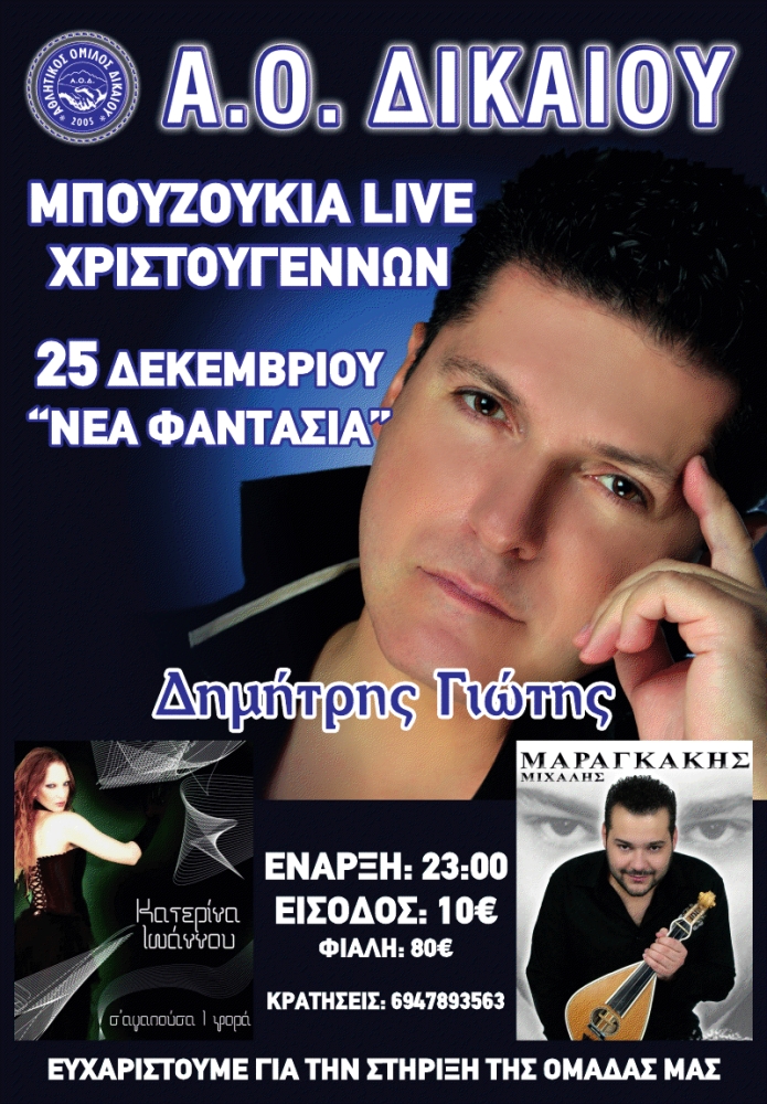 Ο Α.Ο Δικαίου διοργανώνει «Μπουζούκια Live Χριστουγέννων» την Τρίτη 25 Δεκεμβρίου 2012 στη «Νέα Φαντασία» με τους Γιώτη Δημήτρη, Ιωάννου Αικατερίνη, Μαραγκάκη Μιχάλη μαζί με την εξαμελής ορχήστρα τους. Πλούσιο λαϊκό, νησιώτικο και κρητικό πρόγραμμα.