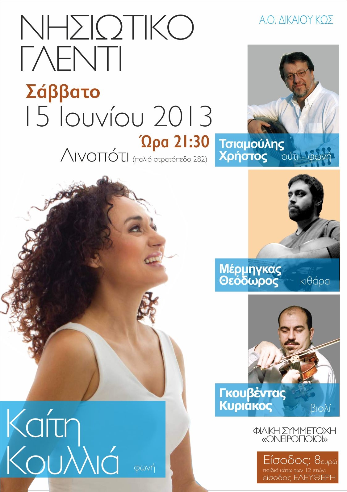 Ο Α.Ο Δικαίου σας καλεί το Σάββατο 15 Ιουνίου και ώρα 21:30 στο Λινοπότι (παλιό στρατόπεδο 282) για μια νησιώτικη βραδιά με την Καίτη Κουλλιά και τους Χρήστο Τσιαμούλη, Θεόδωρο Μέρμηγκα και Κυριάκο Γκουβέντα.