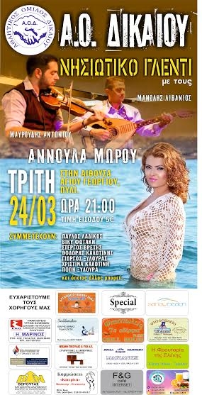 Την Αννούλα Μώρου φιλοξενεί ο Α.Ο Δικαίου αύριο στις 21:00 στην αίθουσα του Αγίου Γεωργίου σε ένα νησιώτικο γλέντι. Τιμή εισόδου 5 ευρώ.