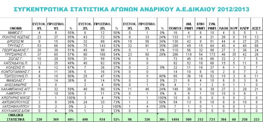 Τέλος στα γενικότερα στατιστικά στοιχεία, ο Γιώργος Τρύπας παρεμεινε 1ος σκόρερ στην ιστορία της ομάδας μας (1457 πόντοι), ενώ τον ακολουθούν ο Γιάννης Αντωνόπουλος (1071 πόντοι), ο Κώστας Πολίτης (845 πόντοι) και ο Παντελής Τριτσάρης (704 πόντοι). Αντίστοιχα στις συμμετοχές πρώτος παράμεινε ο Γιάννης Αντωνόπουλος (139 συμμετοχές), ενώ ακολουθούν ο Γιώργος Τρύπας (96 συμμετοχές), οΚώστας Πολίτης (84 συμμετοχές), ο Θανάσης Μολυβιάτης (71 συμμετοχές) και ο Παντελής Τριτσάρης (69 συμμετοχές).