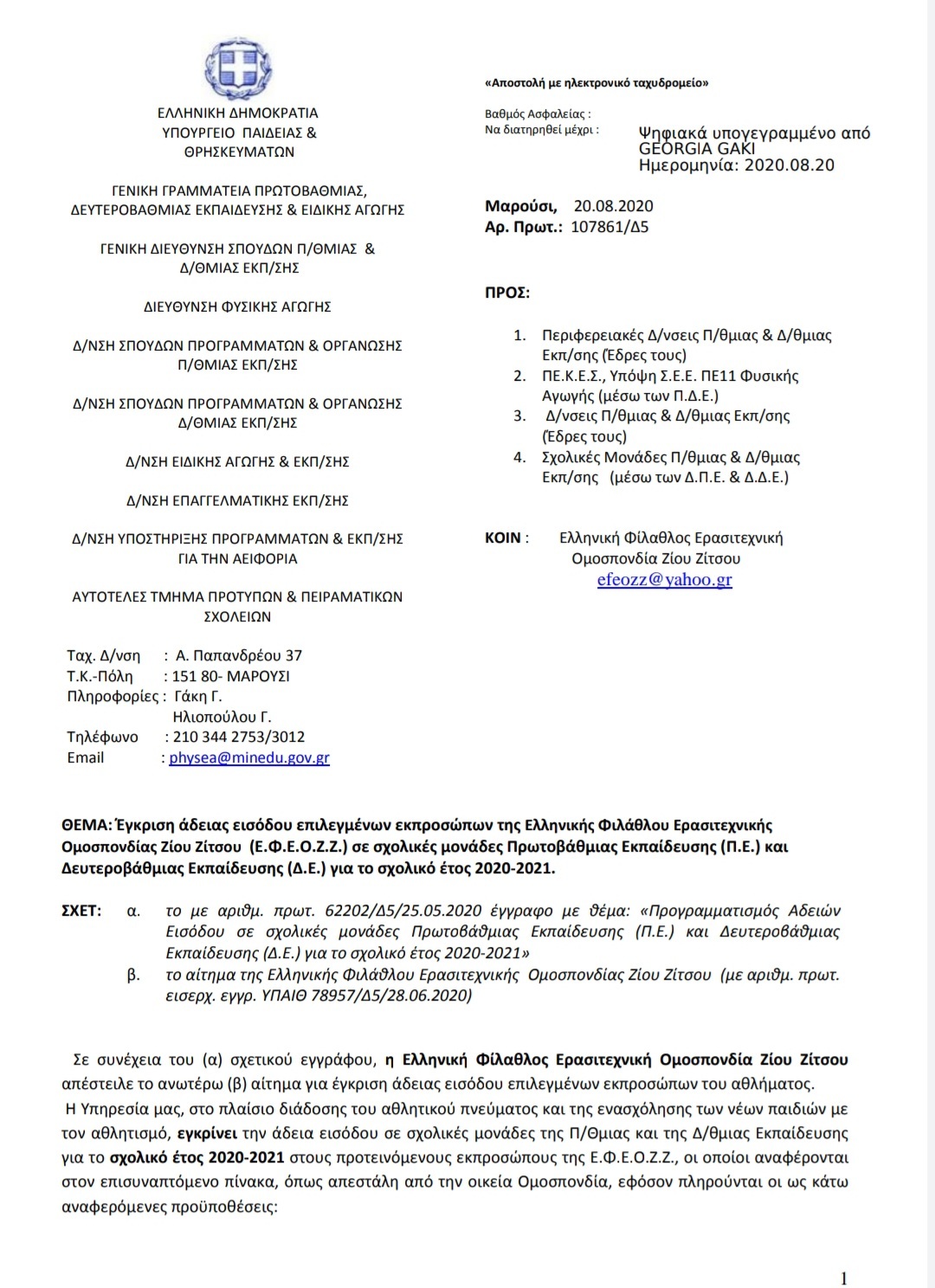 Μετά από αίτημα της ελληνικής Ομοσπονδίας Εφεοζ, εγκρίθηκε η απόφαση της άδειας εισόδου στην πρωτοβάθμια και δευτεροβάθμια εκπαίδευση από το υπουργείο Παιδείας και Θρησκευμάτων.