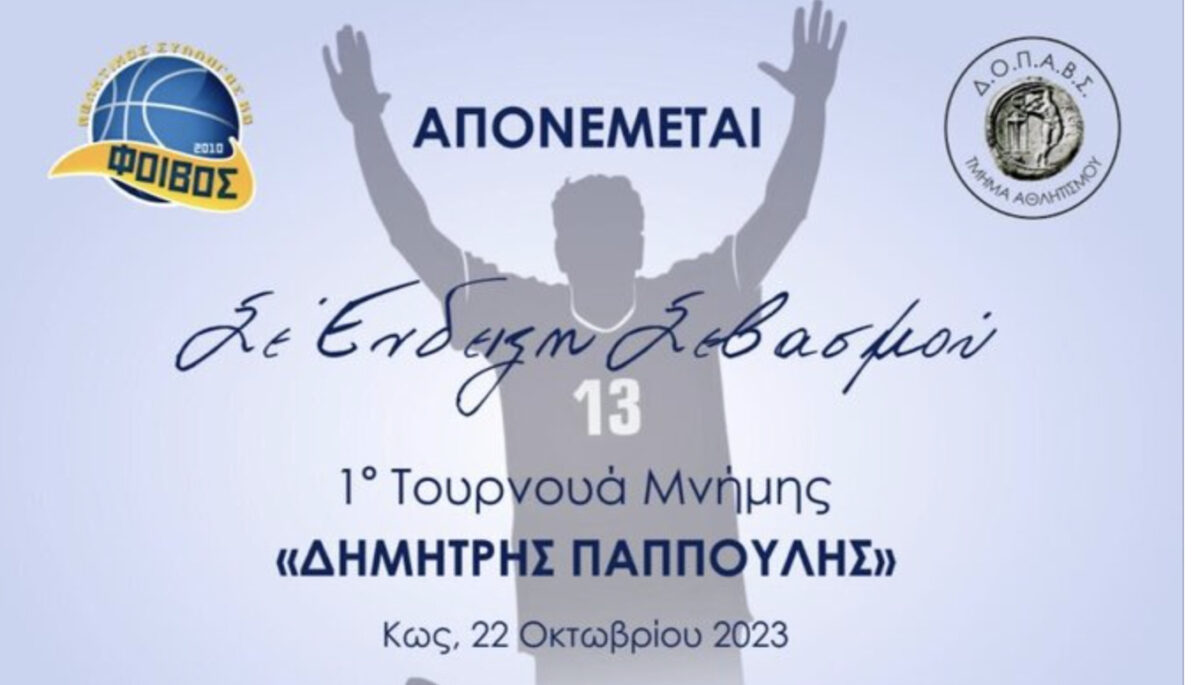 ”Το Δ.Σ. του Α.Σ. Φοίβος Κω ευχαριστεί θερμά την Τ.Ε. Ε.Ο.Κ. Δωδεκανήσου και ιδιαίτερα τον πρόεδρο της κ. Κουγιό Παντελή, για την πολύτιμη βοήθεια και συμβολή του στην υλοποίηση του 1ου Τουρνουά καλαθοσφαίρισης ”Δημήτρης Παππούλης”.