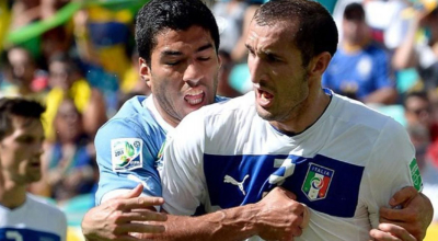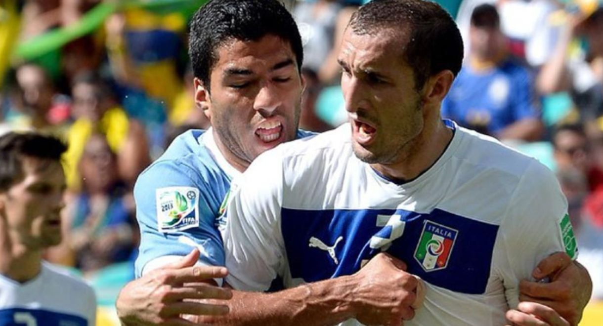 Στο τελευταίο παιχνίδι της Ουρουγουάης στον όμιλο κόντρα στην Ιταλία ο αμυντικός της «σκουάντρα ατζούρα» Κιελίνι σε μια φάση μέσα στην περιοχή δέχτηκε το δάγκωμα από τον Σουάρεζ. Αυτή ήταν η Τρίτη φορά που ο Σουάρεζ χρησιμοποιήσουμε τα δόντια του και παρά το ότι ο διαιτητής δεν είδε τίποτα η FIFA τον τιμώρησε με πρόστιμο 92.000$, ενώ θα απείχε για 4 μήνες από διεθνή παιχνίδια.