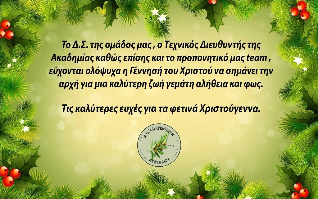 O πρόεδρος του Συλλόγου μας κ.Γεώργιος Ξενικός και τα υπόλοιπα μέλη του Δ.Σ. εν όψει των εορτών των Χριστουγέννων και της Πρωτοχρονιάς εύχεται ολόψυχα σε όλο το προπονητικό team της ομάδος μας , τους αθλητές ,γονείς – κηδεμόνες και φιλάθλους, η Γέννηση του Χριστού να σημάνει την αρχή για μια καλύτερη ζωή γεμάτη αλήθεια και φώς και η νέα χρονιά να φέρει Υγεία, ευτυχία και προσωπικές επιτυχίες για τον καθένα.