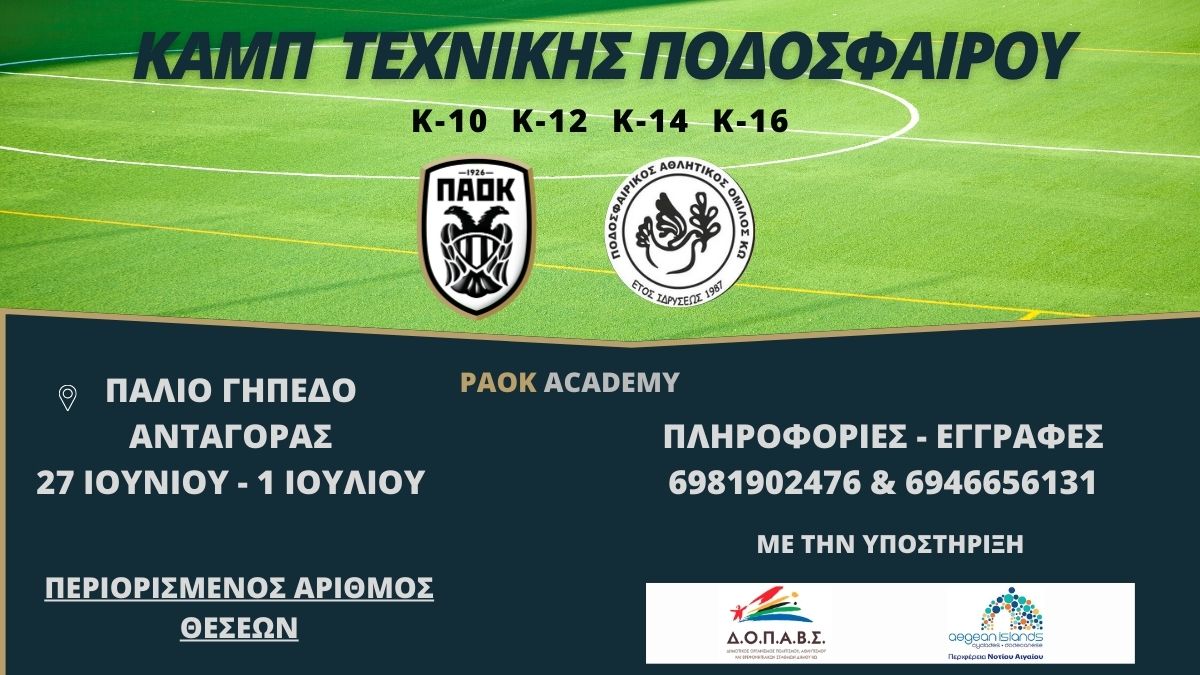 Όλα είναι έτοιμα για καμπ τεχνικής ποδοσφαίρου διοργανώνει η ομάδα του ΠΑΟΚ Κω απ’ τις 27 Ιουνίου έως και την 1η Ιουλίου σε συνεργασία με την ΠΑΕ ΠΑΟΚ και την PAOK Academy αφού το παρών θα δώσουν προπονητές και άνθρωποι του συλλόγου.