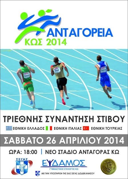 Εν όψει της Τριεθνούς Συνάντησης Στίβου «Ανταγόρεια Κως 2014» αύριο 22 Απριλίου 2014 και ώρα 16:50 με την πτήση Α3224 αφικνούνται στο Νησί μας οι Εθνικές Ομάδες της Ελλάδος της κατηγορίας Εφήβων-Νεανίδων και Παίδων-Κορασίδων αποτελούμενες από 36 αθλητές και αθλήτριες, προκειμένου να ξεκινήσουν την προετοιμασία τους εν όψει της συμμετοχής τους στη διοργάνωση.