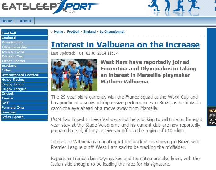 Ο Ολυμπιακός μαζί με την Φιορεντίνα και την Γουέστ Χαμ ενδιαφέρονται για την μεταγραφή του 30χρονου μέσου, Ματιέ Βαλμπουενά της Μαρσέιγ, όπως αναφέρει το eatsleepsport.com.