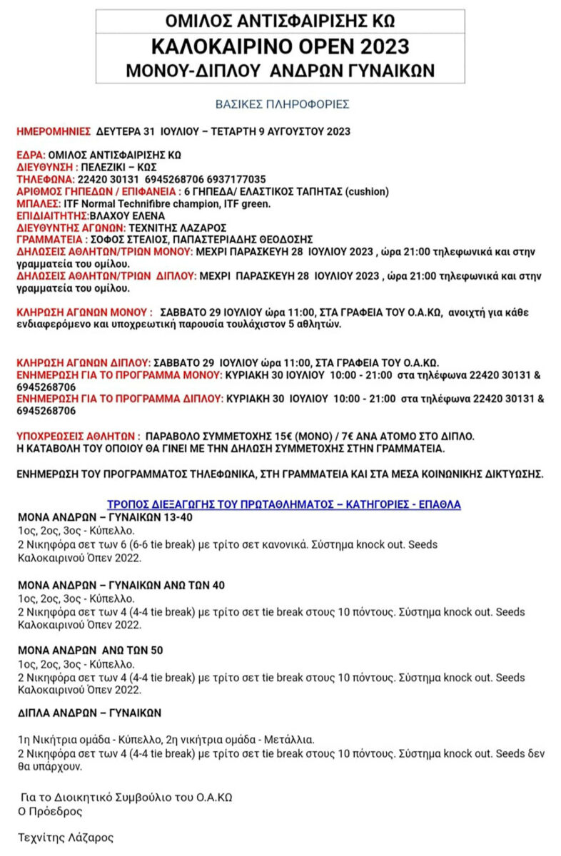 Όμιλος Αντισφαίρισης Κω: Καλοκαιρινό τουρνουά Open 2023 από 31/7 – 9/8