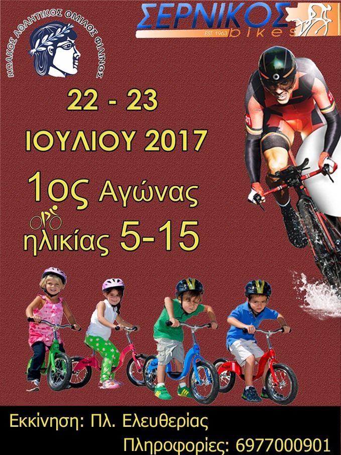 Ο Κωακός Α.Ο. Φιλίνος σας προσκαλεί στον παιδικό αγώνα ποδηλασίας που διοργανώνει το Σάββατο και τη Κυριακή 22-23/7/17 στις 20,00.