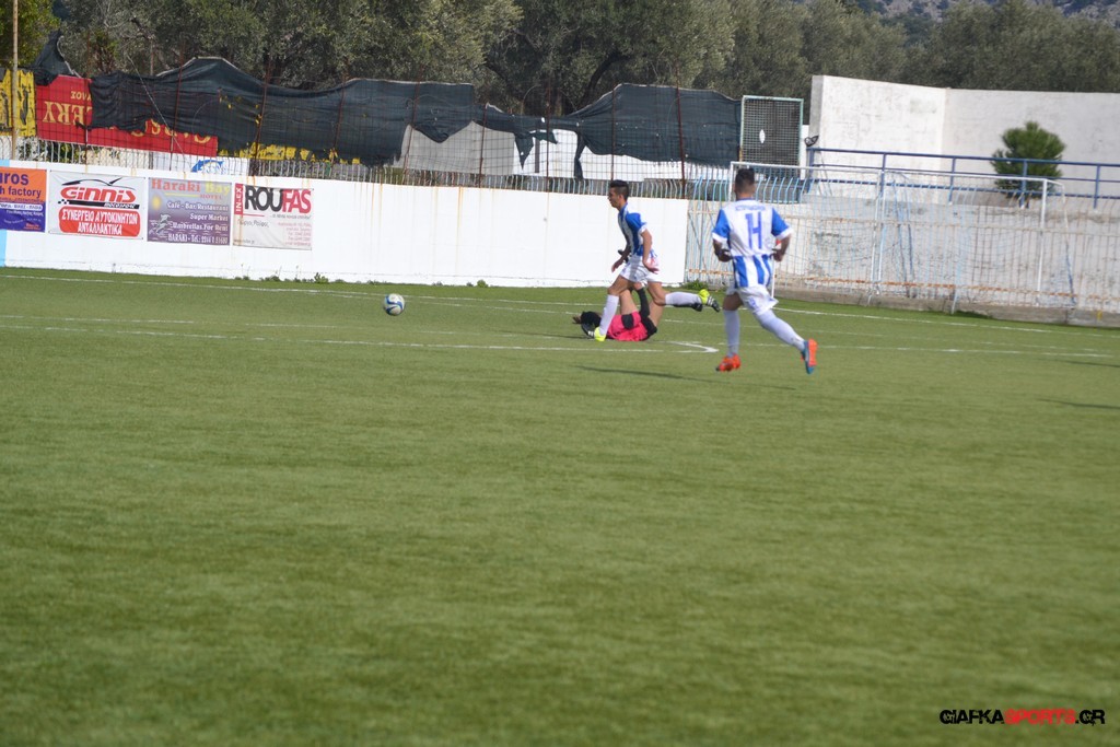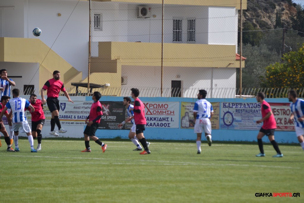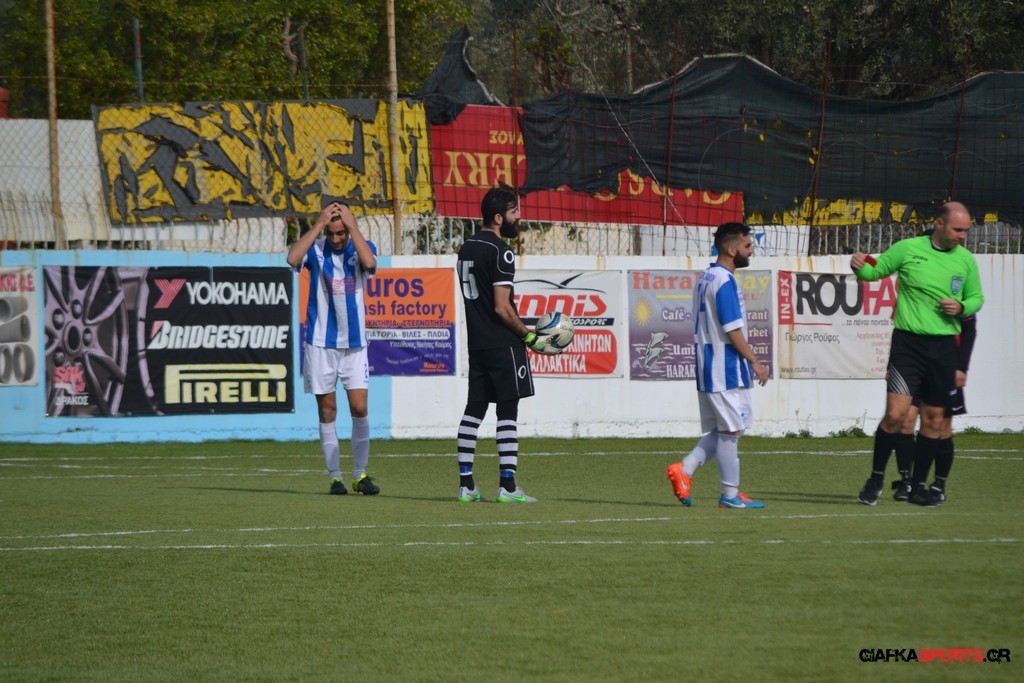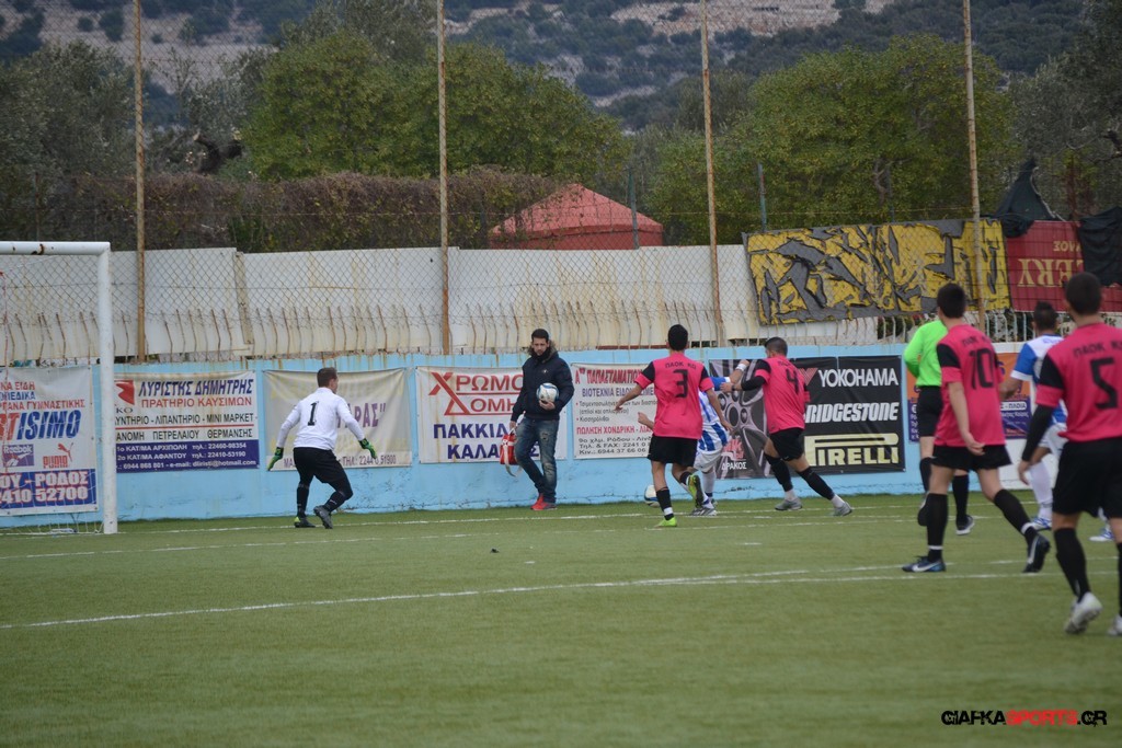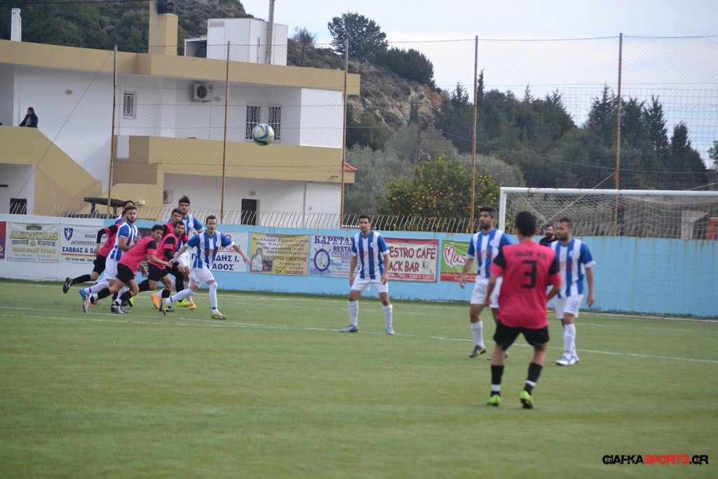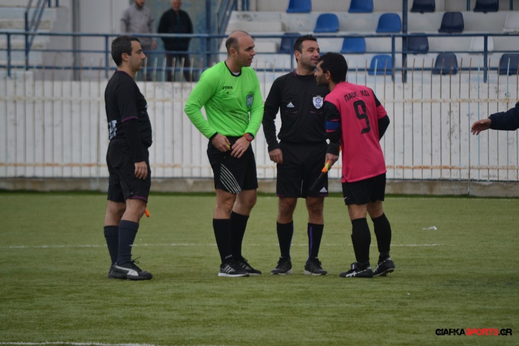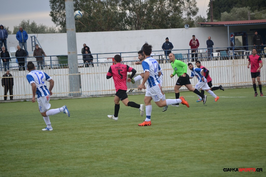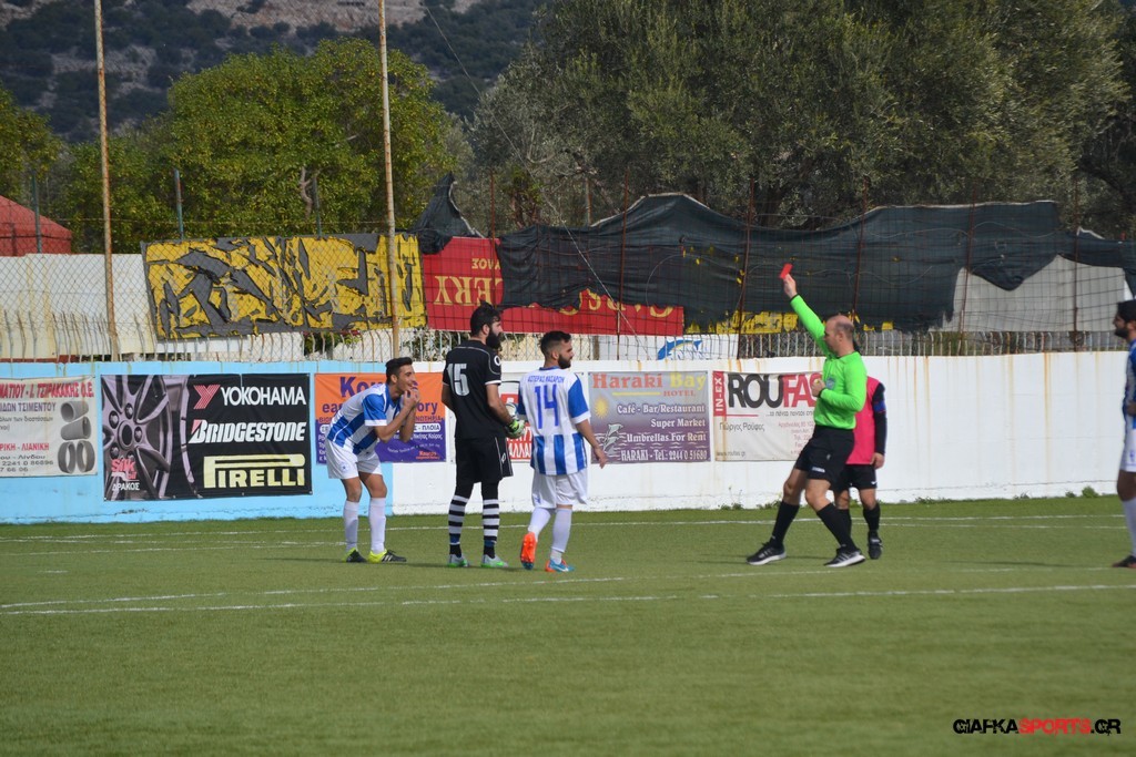 Ο ΠΑΟΚ Κω κατάφερε να ισορροπήσει το ματς και στο 38′ σε μια αντεπίθεση ο Μικές Ξυπολιτάς μετά από κάθετη του Μακαράνα ανατράπηκε από τον Φωταρά που ήταν τελευταίος παίκτης με τον Πατσιόπουλο να τον αποβάλλει με απευθείας κόκκινη κάρτα . Στο 39′ ο Κουβαράς απείλησε με φάουλ με τον Τόππο να αποκρούει στην αριστερή γωνία και να κρατά το 1-0 ενώ λίγο πριν το ημίχρονο ο Κουβαράς με κεφαλιά στο δεύτερο δοκάρι έστειλε την μπάλα λίγο άουτ.