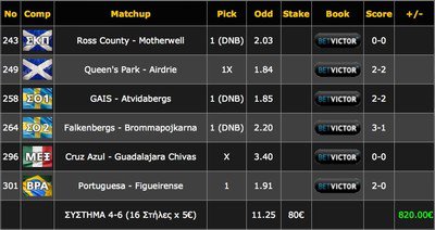 Όσοι απο εσάς επιλέξατε χθες (Σάββατο 4 Αυγούστου) να ακολουθήσετε το Σύστημα είστε πλέον κατά 820 Ευρώ πιο πλούσιοι. Αυτό γιατί από τα 6 παιχνίδια τα 4 ήρθαν όπως ακριβώς προέβλεψε το www.betarades.com ενώ δύο αγώνες δίνονταν με Draw No Bet (στην ισοπαλία επιστρέφεται το ποντάρισμα) και έληξαν ισόπαλοι.